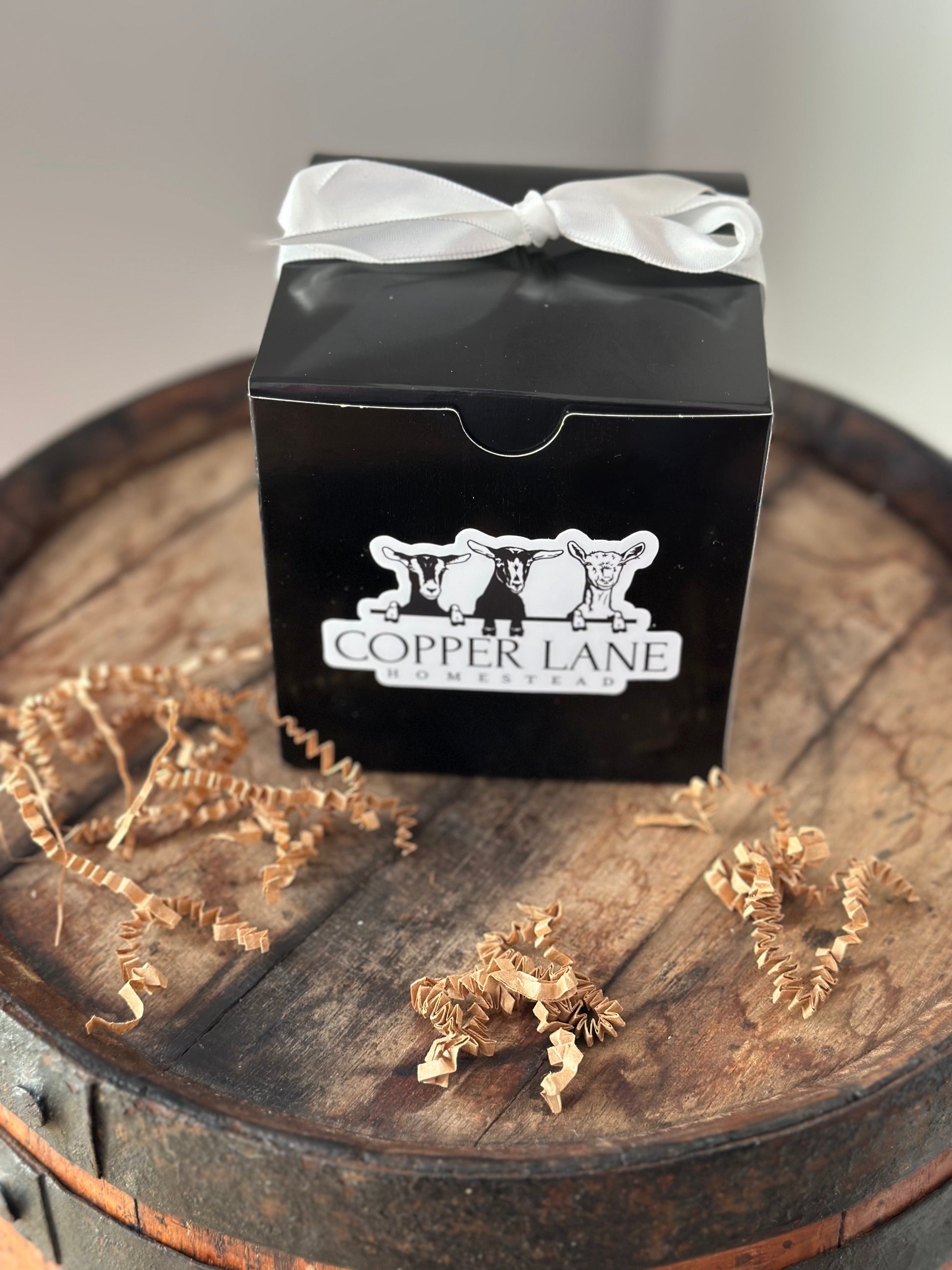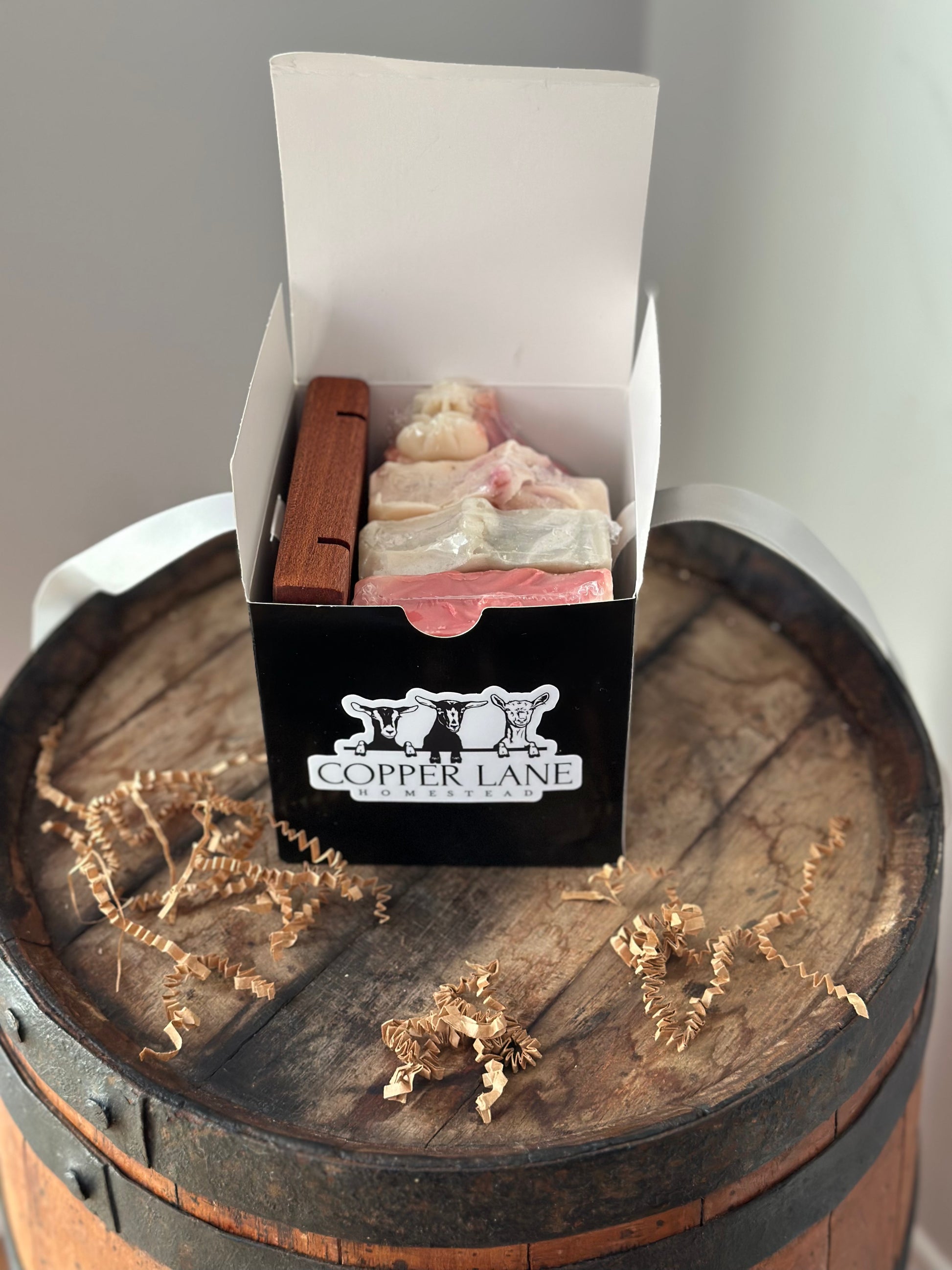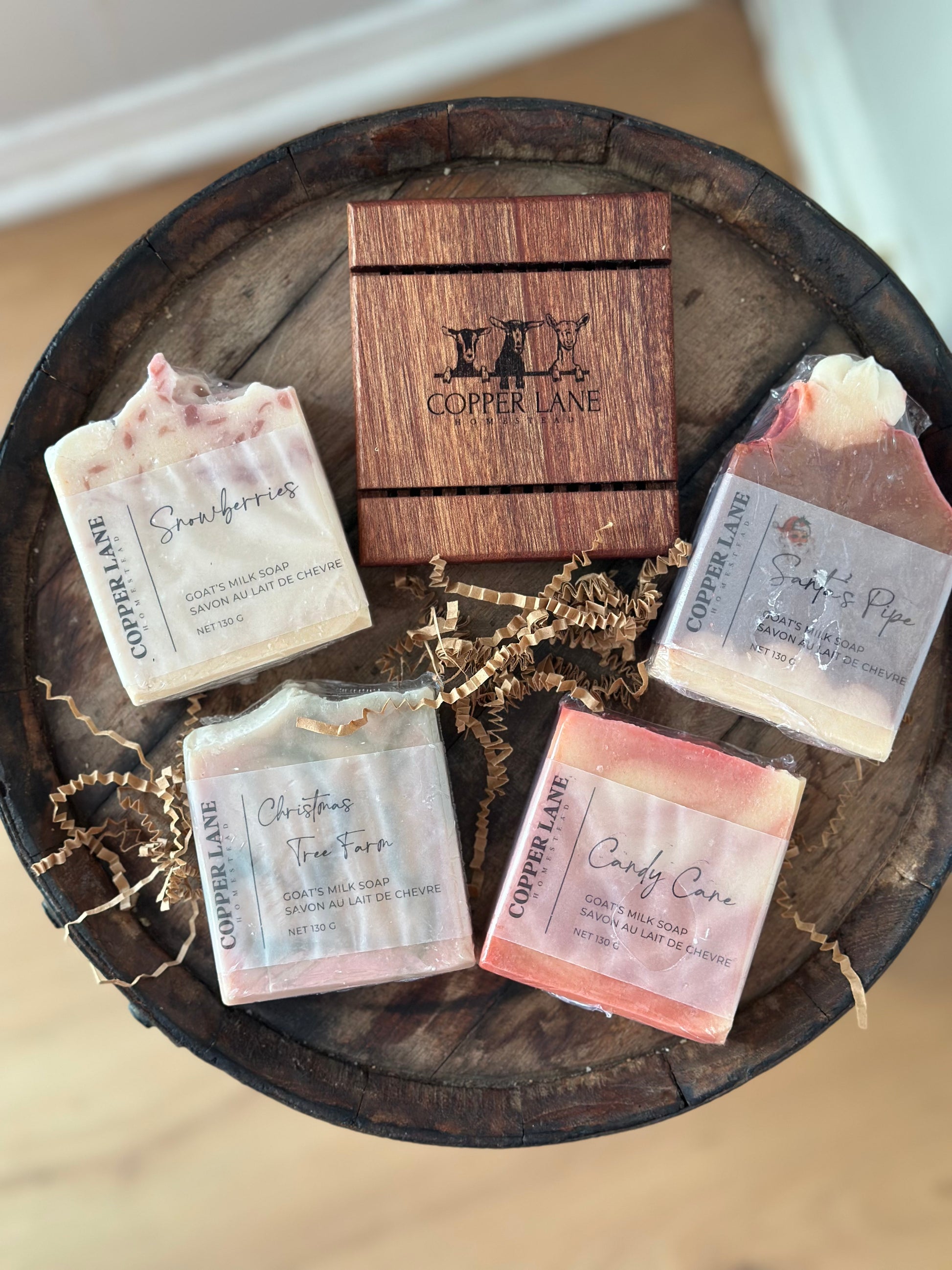 4 Christmas themed scented goats milk soaps and 1 soap dish neatly packaged in a gift box ready to give!