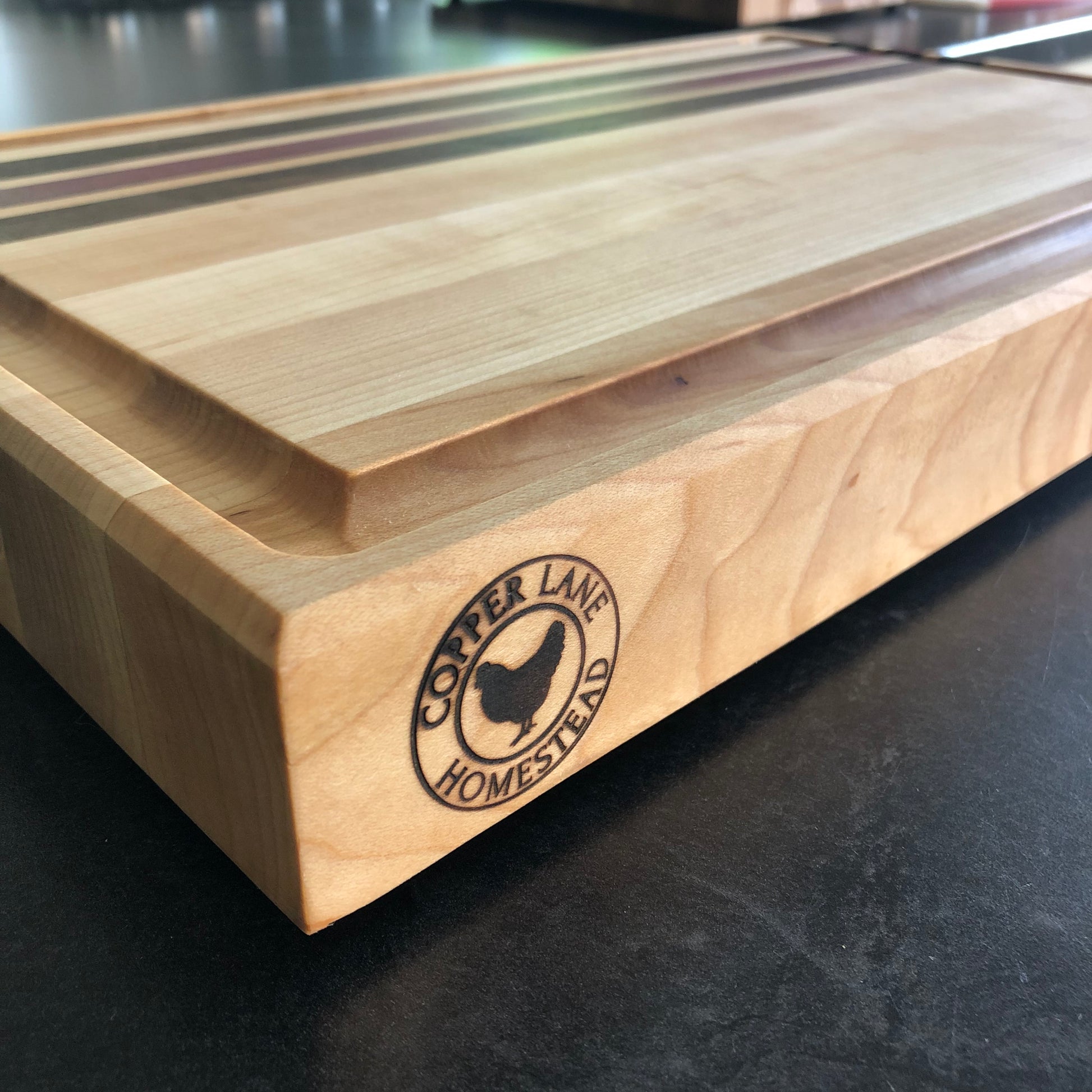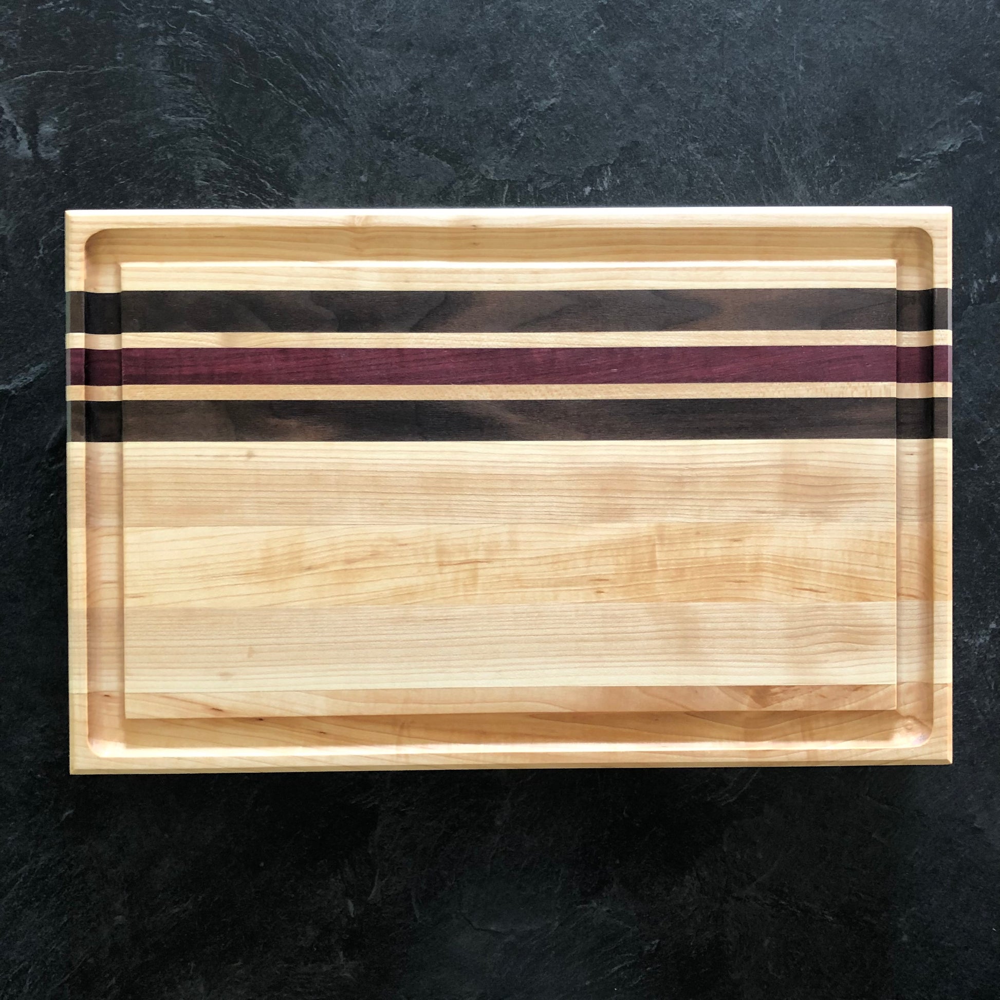 Our classic cutting board in Maple accented with walnut and Purple Heart and completed with a juice groove. This board provides an excellent opportunity to add an engraving to personalize the perfect gift for that special someone.