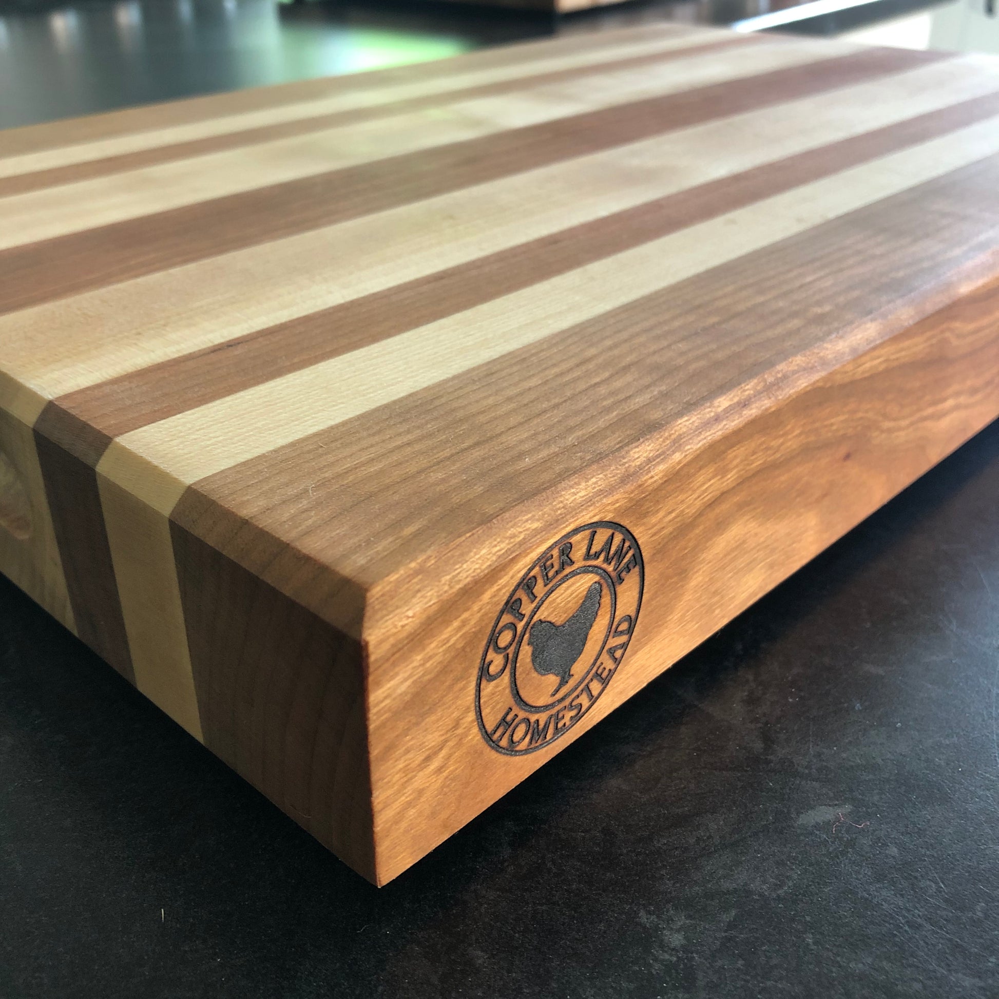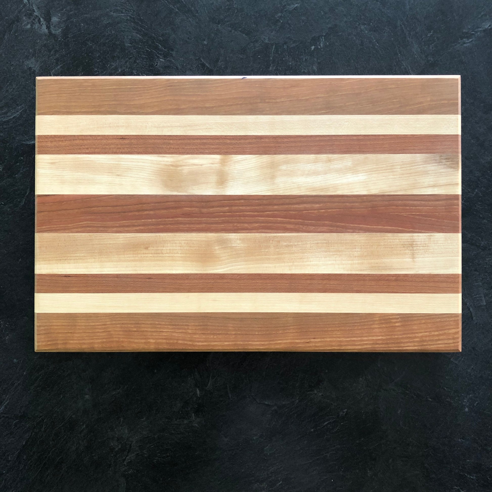 Made from Cherry and Maple, A clean and simple cutting board maximizing cutting surface in the absence of a juice groove. A perfect board to add your personal touch with one of our engraving options.