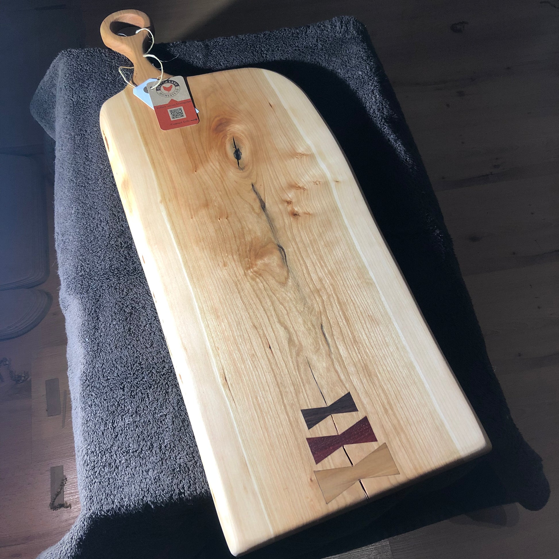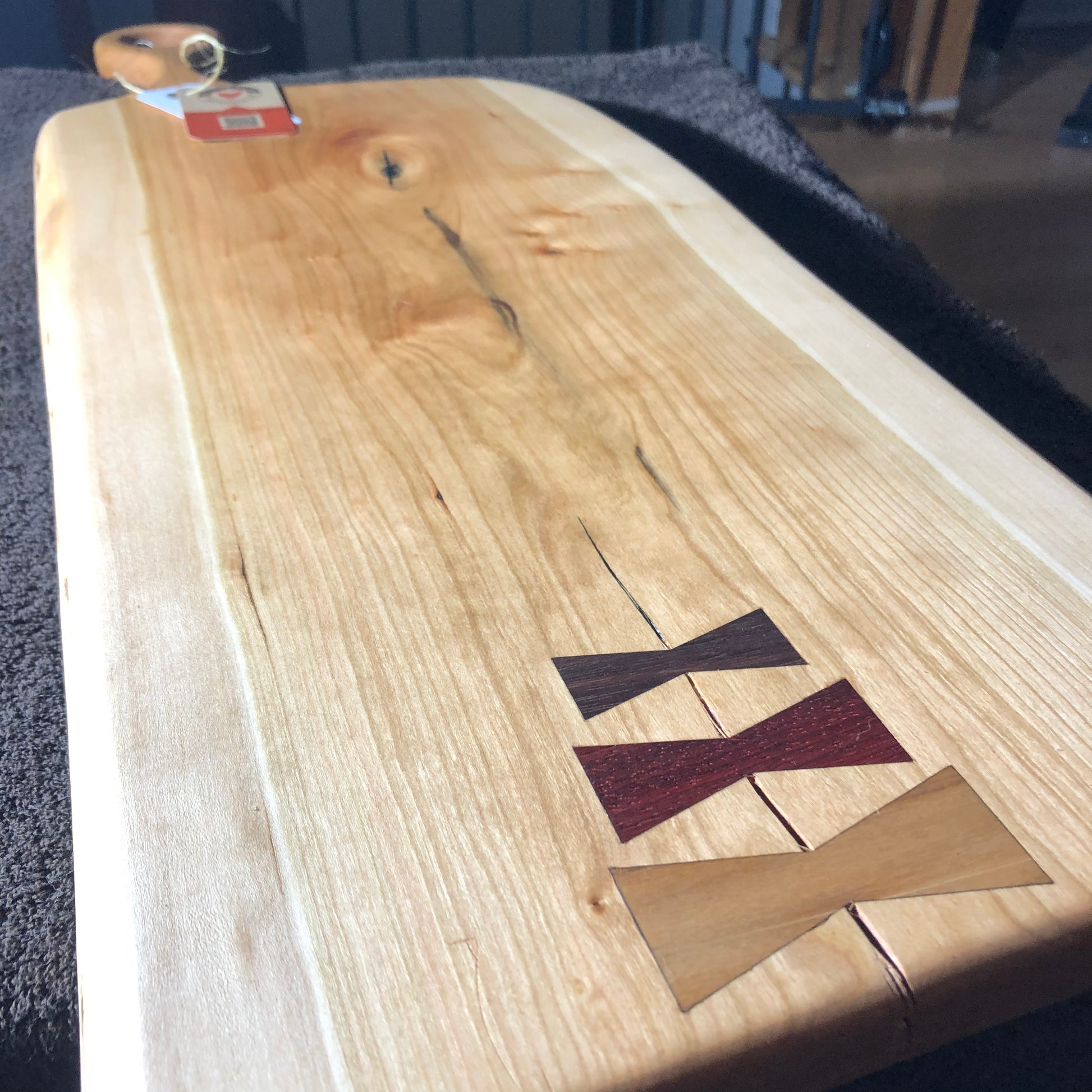 Large charcuterie board perfect for entertaining. Live edge cherry complete with 3 bow tie inlays made from bocotte, African Padauk, and Maple species.