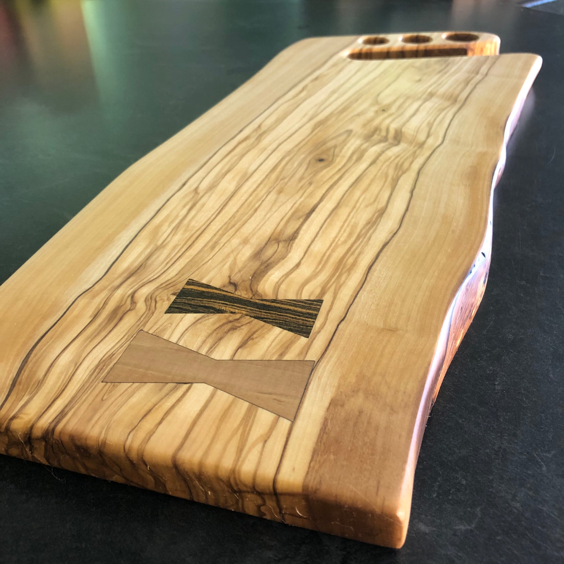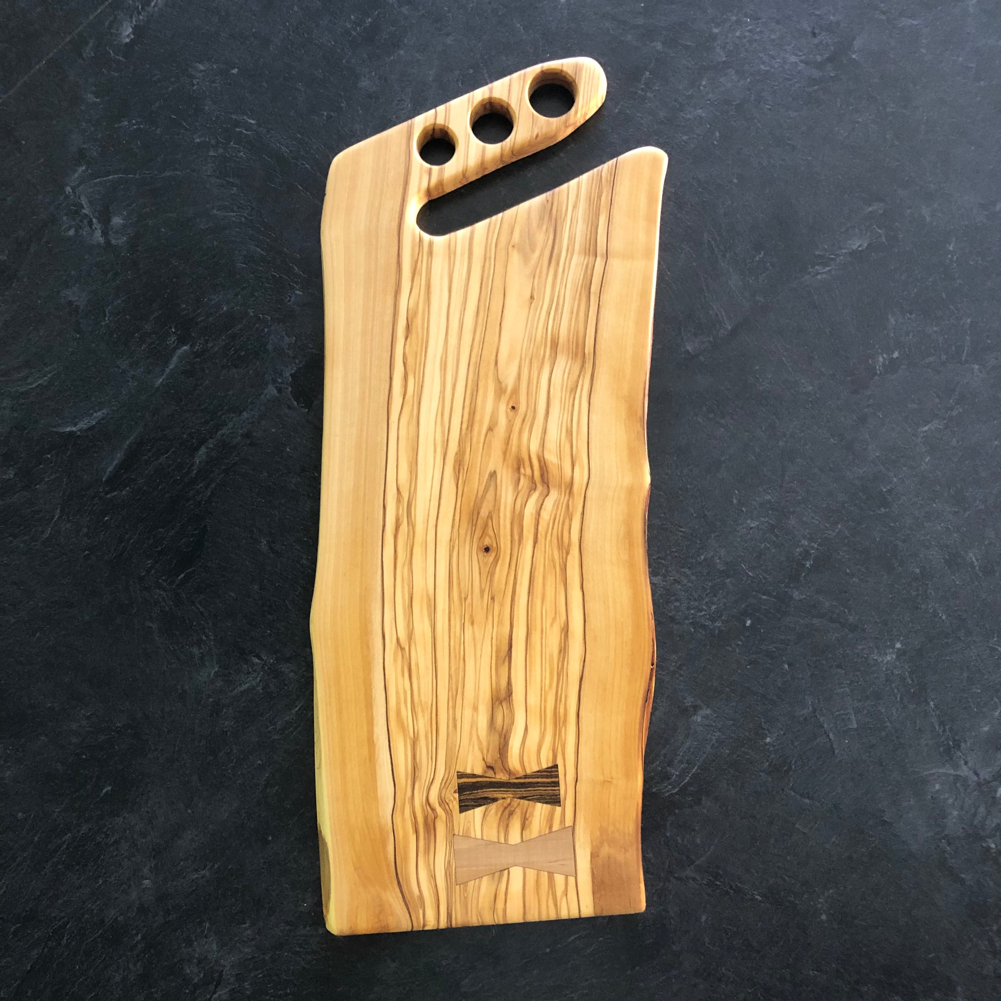 Beautiful and unmatched grain of Olive Wood along with a unique handle design and 2 bow tie inlays out of Bocotte and Maple varieties.